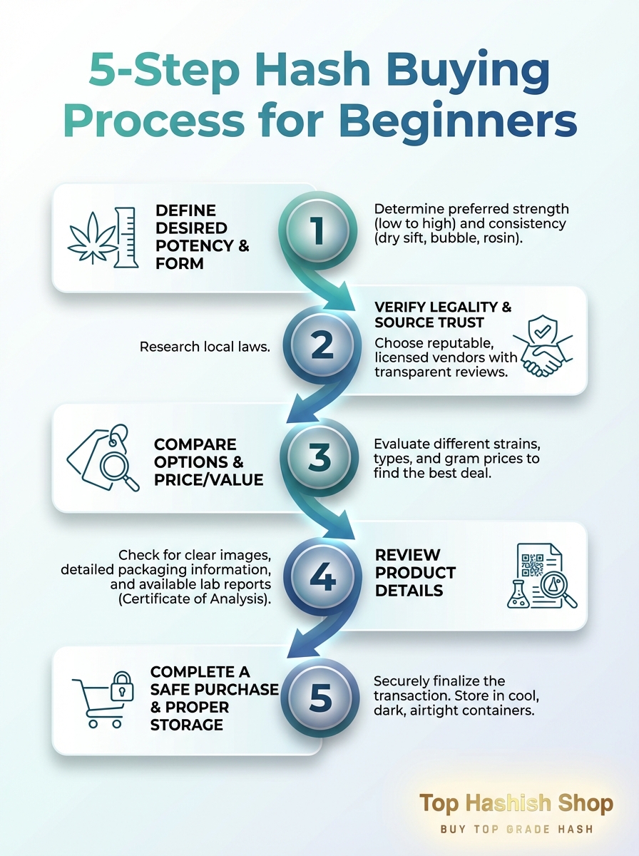 Once you understand types, prices, and legality, you can move through a simple process that turns “hash where to buy” into a structured, low risk first purchase.