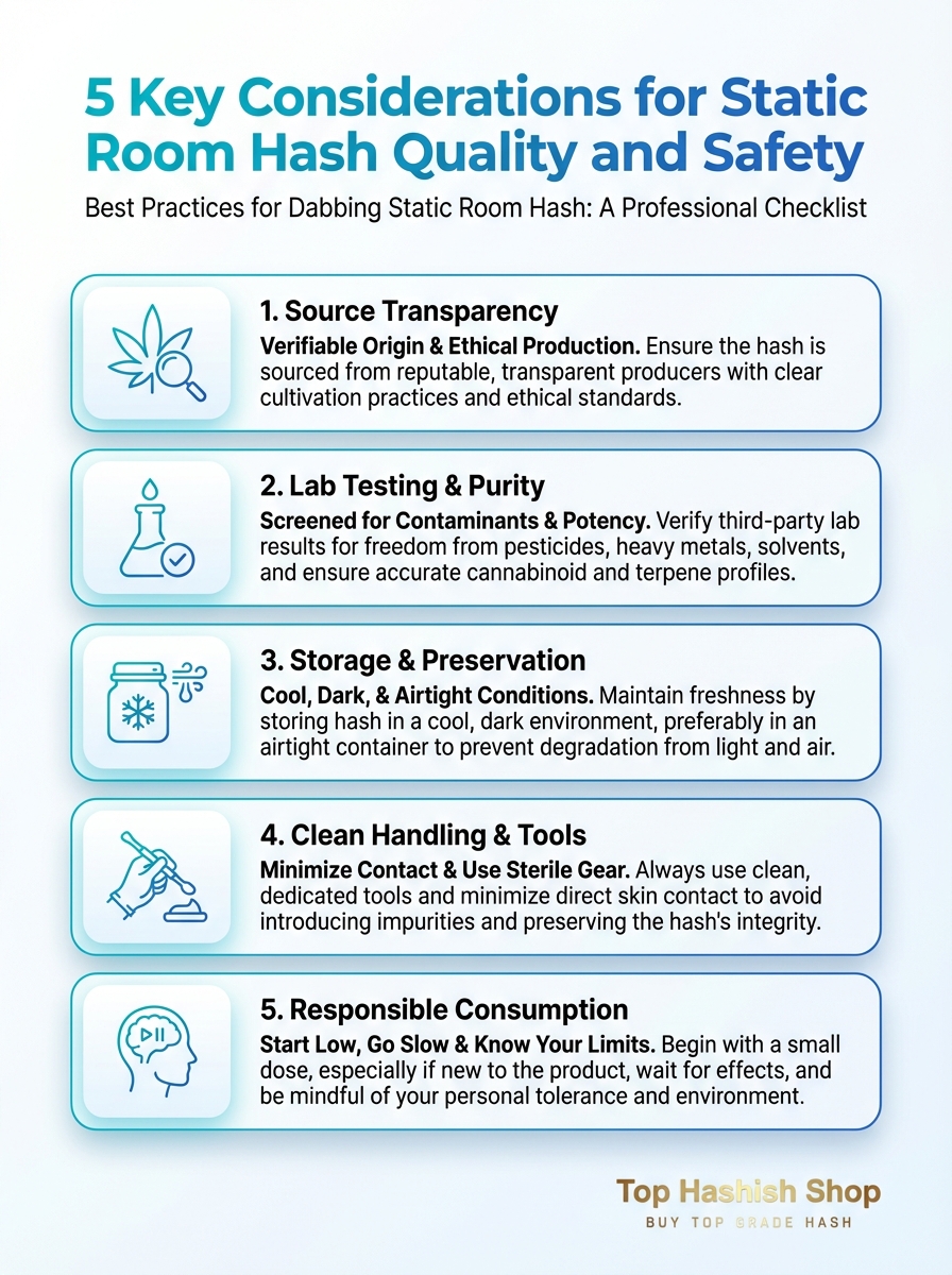 This infographic highlights five key factors that influence the quality and safety of dabbing static room hash. Learn best practices to optimize results and reduce risk.