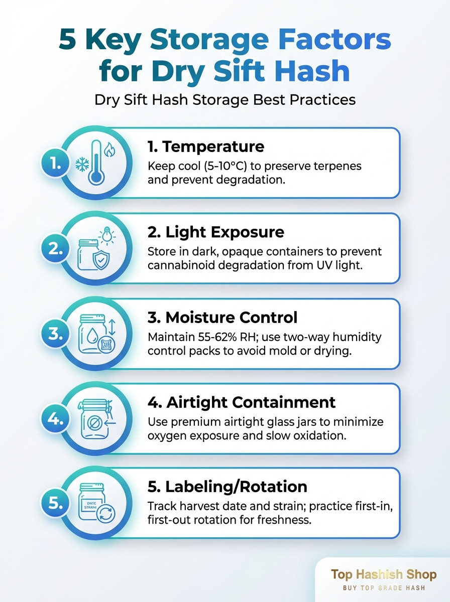 A concise visual guide to the five key storage factors for dry sift hash. Learn best practices to preserve potency and freshness.