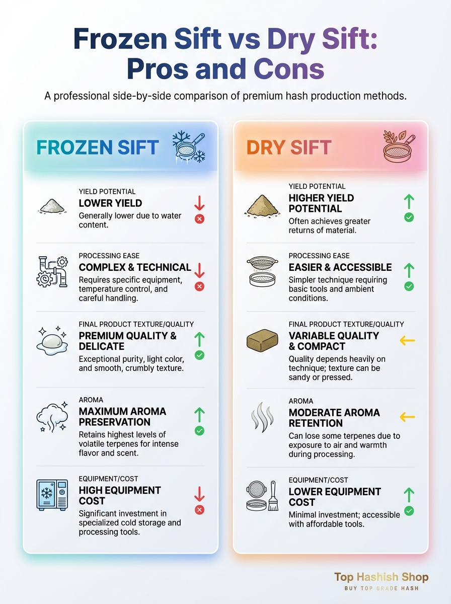 | Which is better for everyday use? | For regular sessions many collectors prefer efficient, consistent dry sift, while frozen sift is often reserved for connoisseur sessions, limited batches, or specific strain hunts such as Point Break based preparations. |