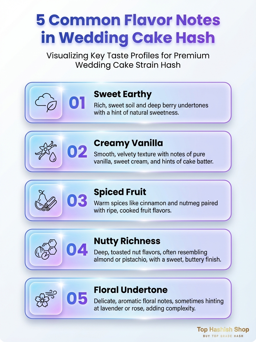 This infographic highlights the five most common flavor notes in Wedding Cake hash. Use it as a quick guide to recognize its profile.